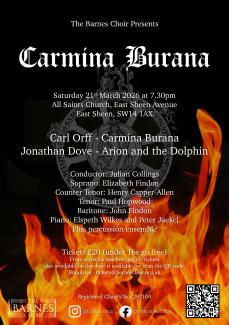 Sat 21 Mar 2026 | 19:30 - 21:30 Location: All Saints Church, East Sheen, SW14 8AX Book nowGeneral admission: £20Under 16: free of charge (please do book a ticket)Join the Barnes Choir for:Jonathan Dove - Arion and the DolphinCarl Orff - Carmina BuranaFlyer
